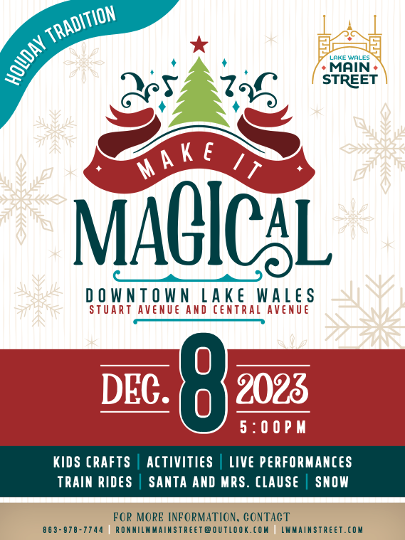 Lake Wales will become a winter wonderland! Main Street Lake Wales invites you to ring in the season with a holiday celebration in historic downtown Lake Wales at the 12th annual Make It Magical holiday event. Enjoy shopping in our sweet downtown and strolling through local shops, art and craft vendors with plenty of holiday décor, and live music. Free admission treats guests to crafts, activities, a visit with Santa, and SNOW!! 5:00-8:00 p.m. for event, sponsor, and vendor information email Ronni at ronnilwmainstreet@outlook.com